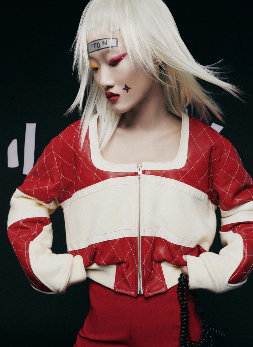 Feng: vestido e brincos, KENZO. Luvas, PAUL SMITH. Collants, da produção.