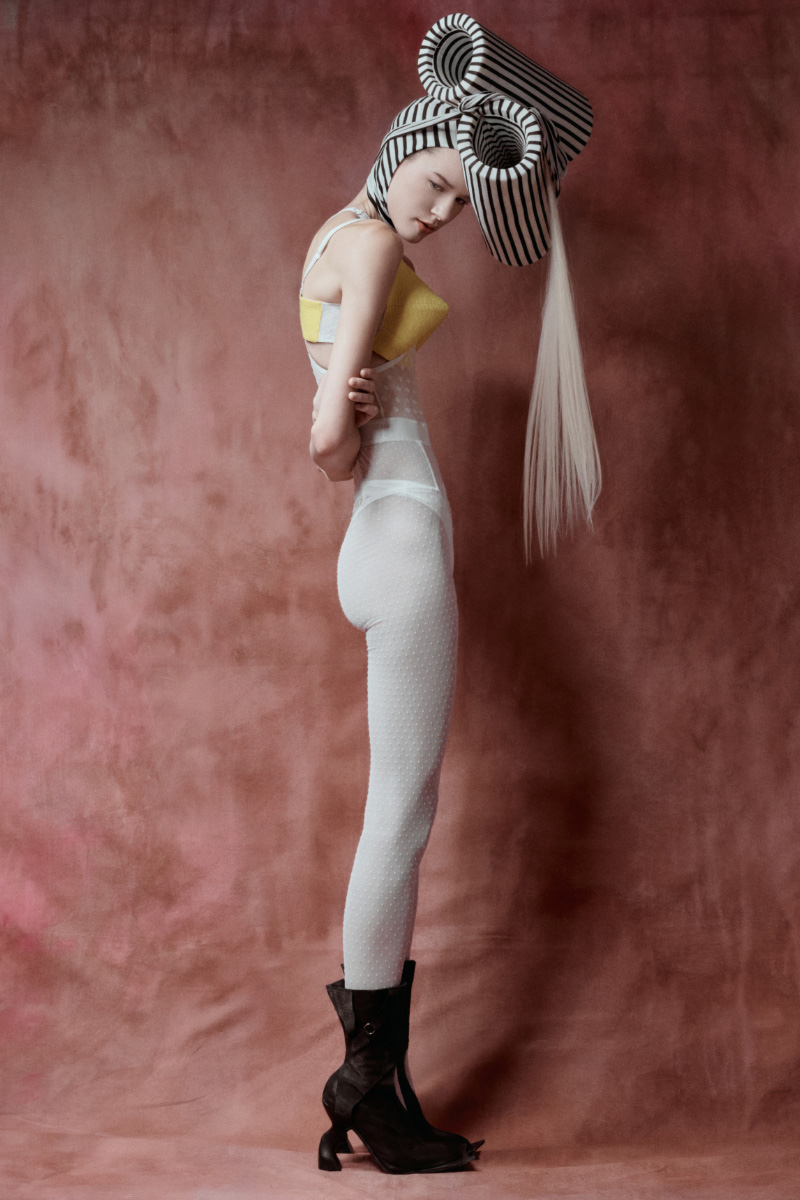 Top, bodysuit e headpiece, tudo CAITLIN BAY. Sapatos, SOPHIE TINÉ.