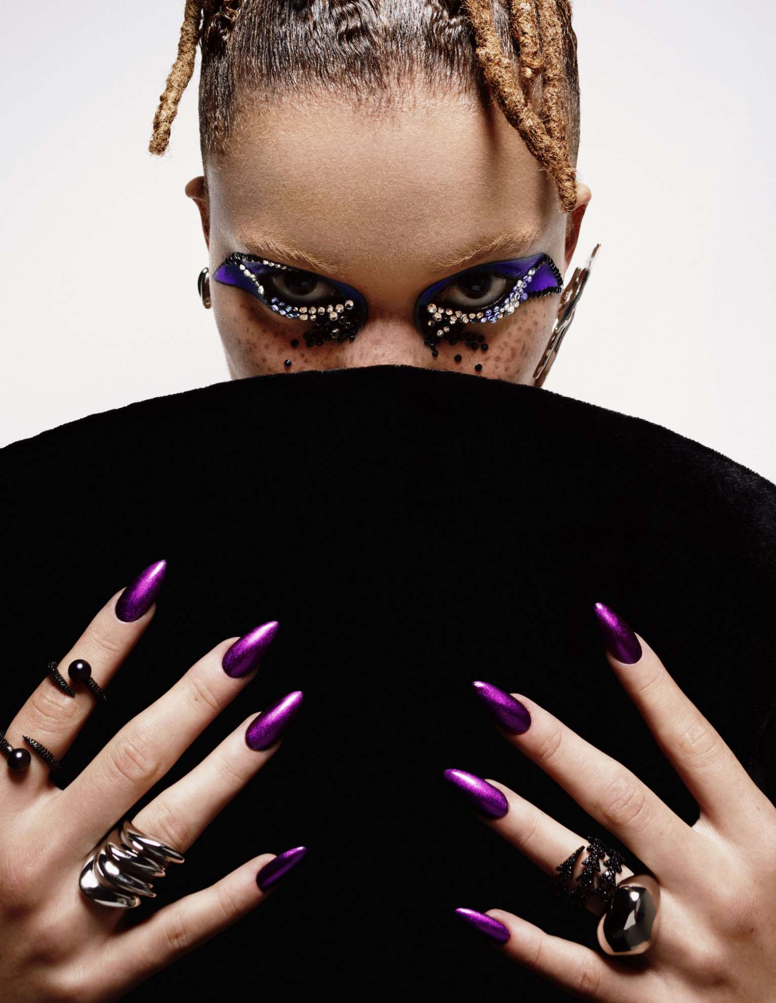 Batom (usado como sombra de olhos) Colour Stick, no tom Ultramagnetic, € 31, sombra de olhos Eyeshadow 5 Colours Sciomancer, no tom Purple, € 65, eyeliner, no tom Technical Black, € 36, máscara de pestanas Astronomical, € 41, tudo BYREDO.