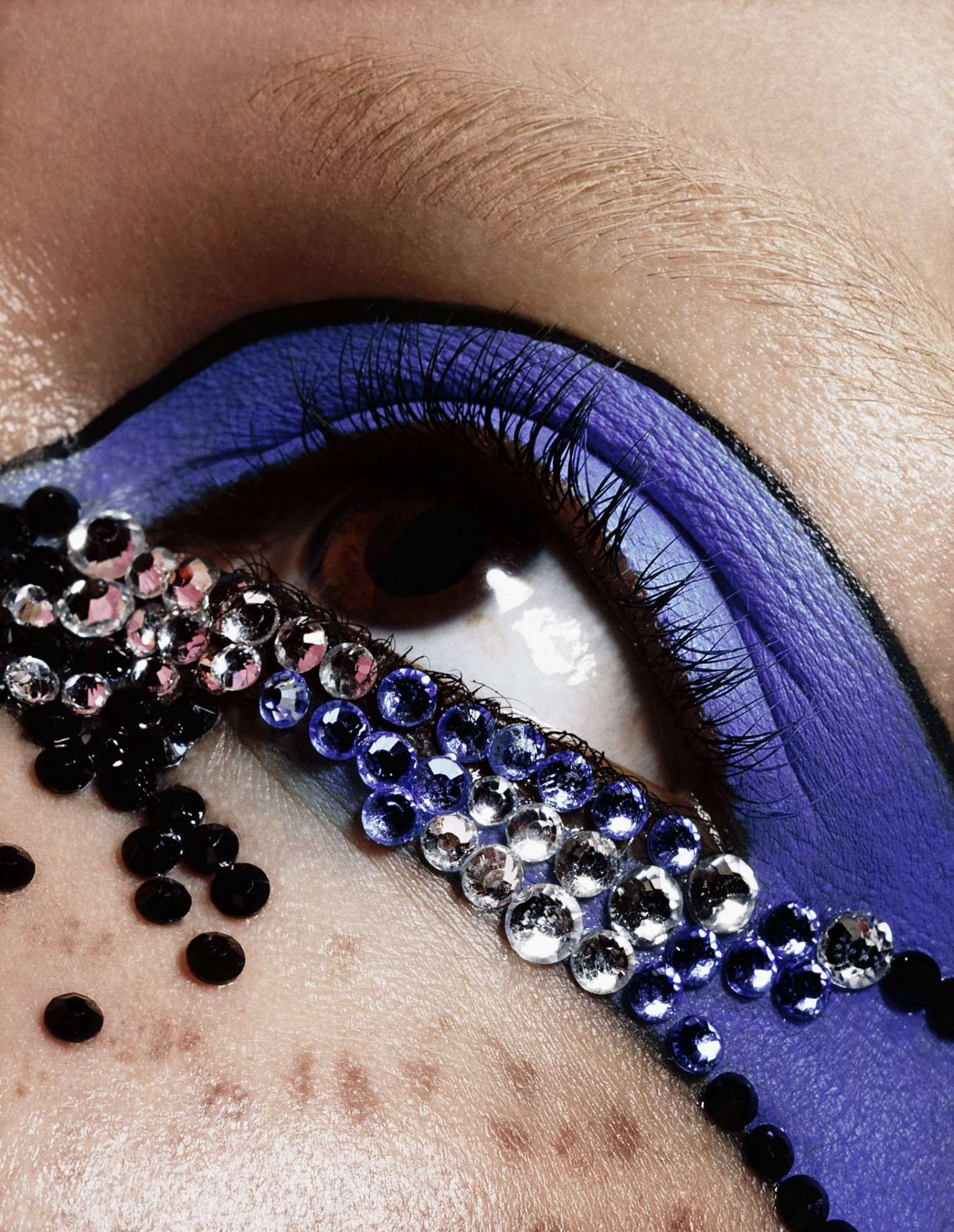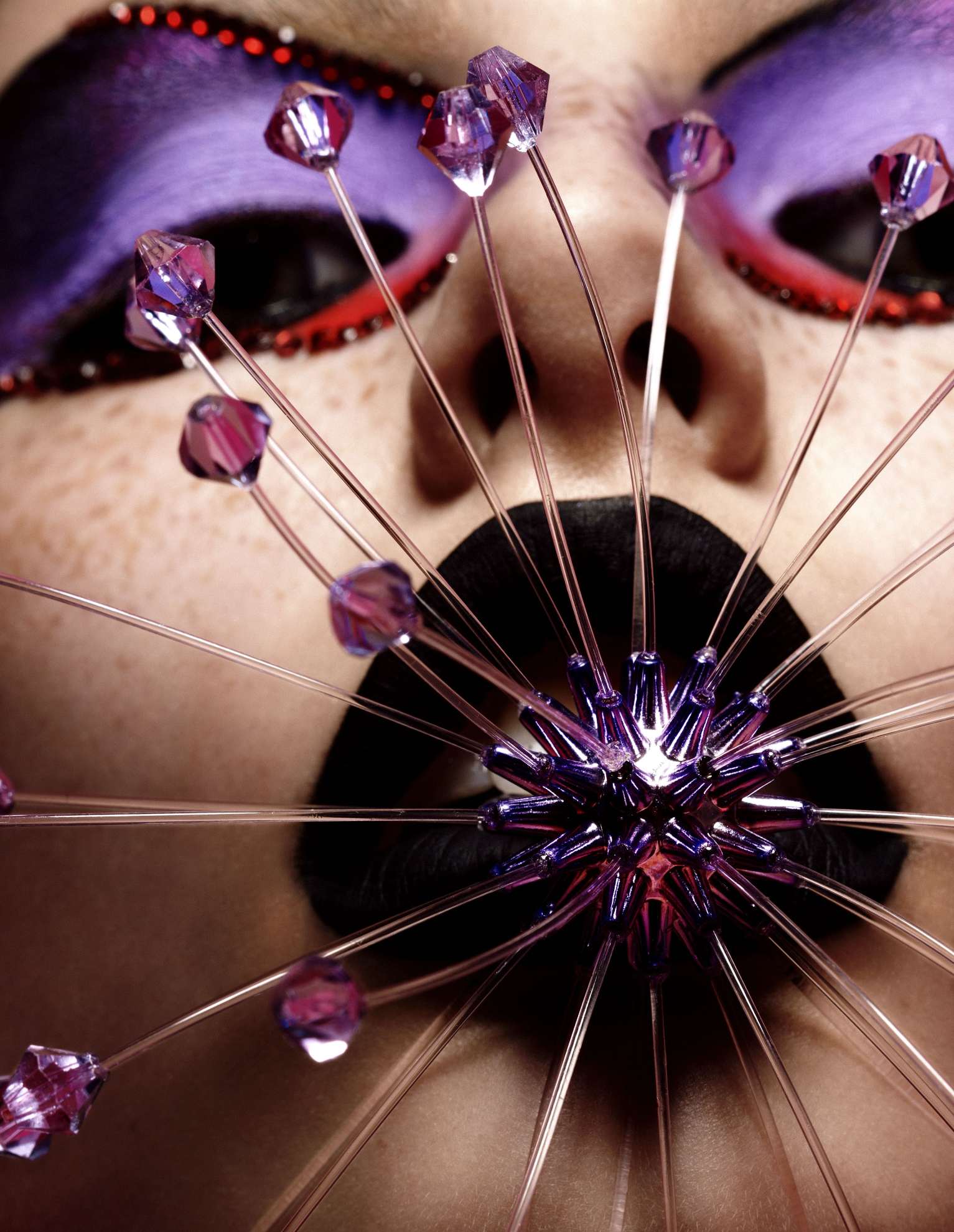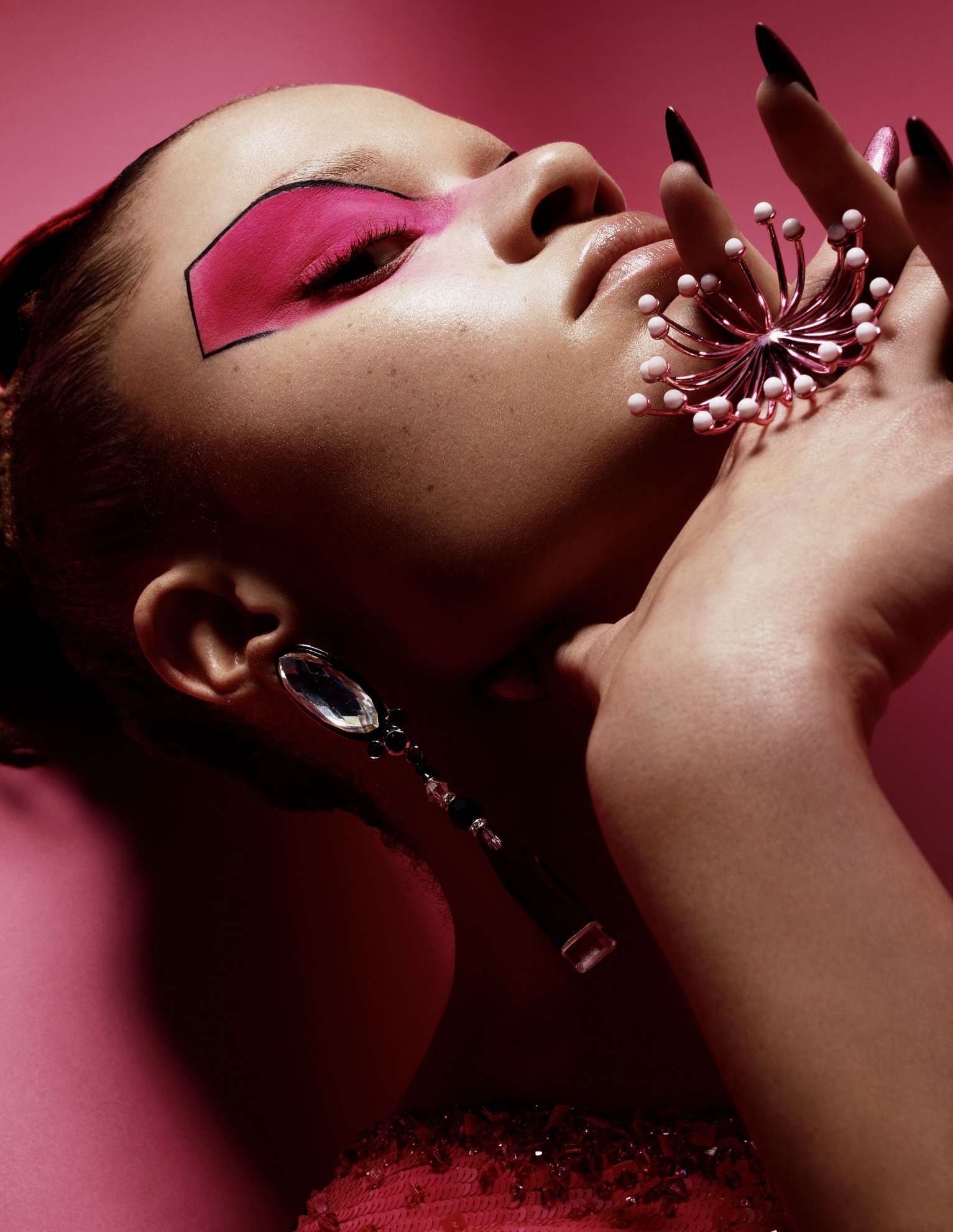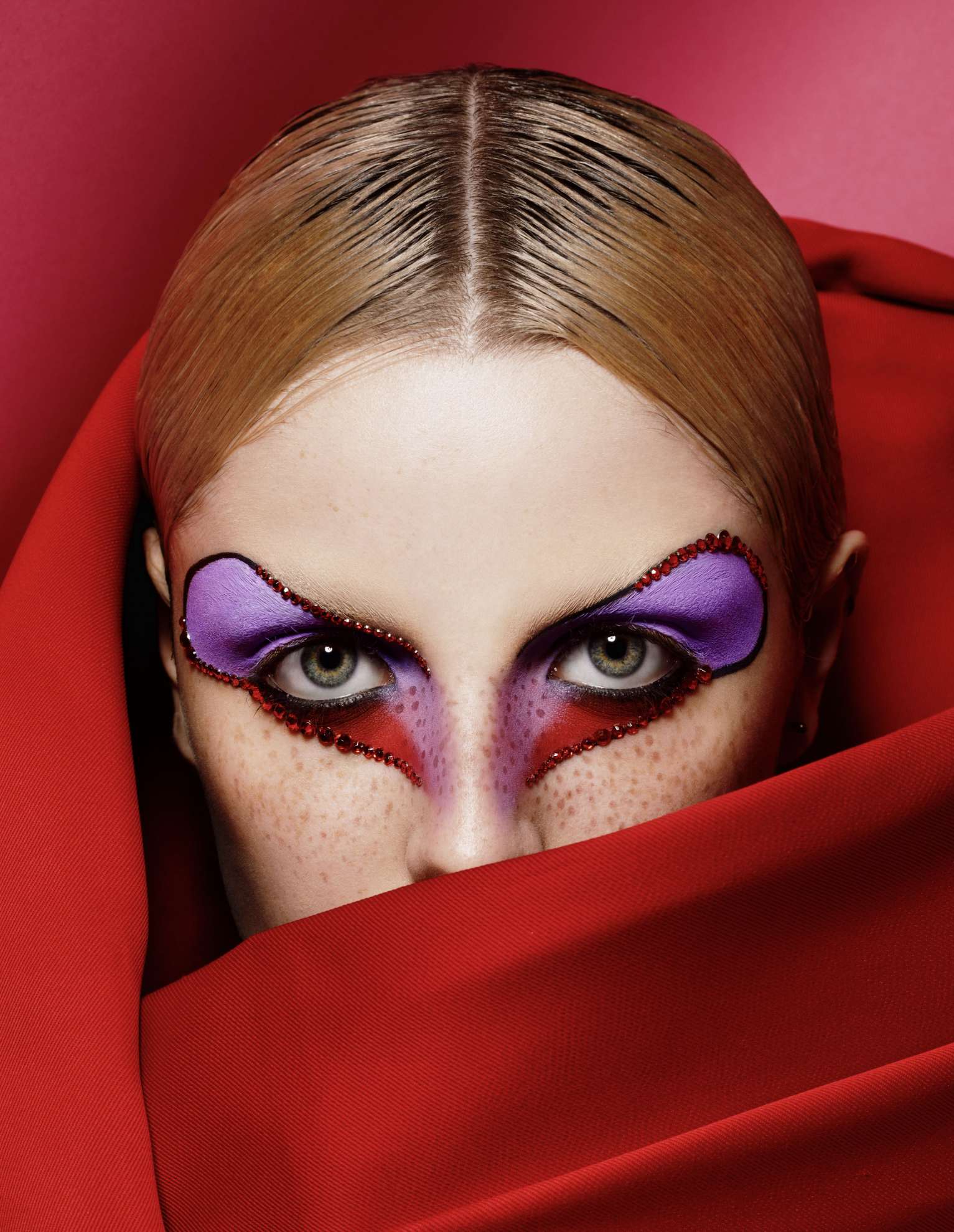 Anna: Brincos (na boca) Crystal Ball em metal cromado e resina, HUGO KREIT. Batons (usados na face) La Sélection Bâtons de Couleur, nos tons Babi, Ancient e Great Sand, € 93, lápis de sobrancelha (usado nas maçãs do rosto) All-In-One Refillable, no tom Dusk, € 39, batom (usado como sombra de olhos) Colour Stick, no tom Purple Stinger, € 31, sombra de olhos Eyeshadow 5 Colours Sciomancer, no tom Purple, € 65, batom (usado nos olhos) Red Armchair, € 45, eyeliner, no tom Technical Black, € 36, lápis Kajal, no tom Kali Kali, € 29, máscara de pestanas Space Black, € 41, batom, no tom Destroyer, € 31, e sombras de olhos (usadas nos lábios) Eyeshadow 5 Colours Fêtes Noires, € 65, tudo BYREDO.
