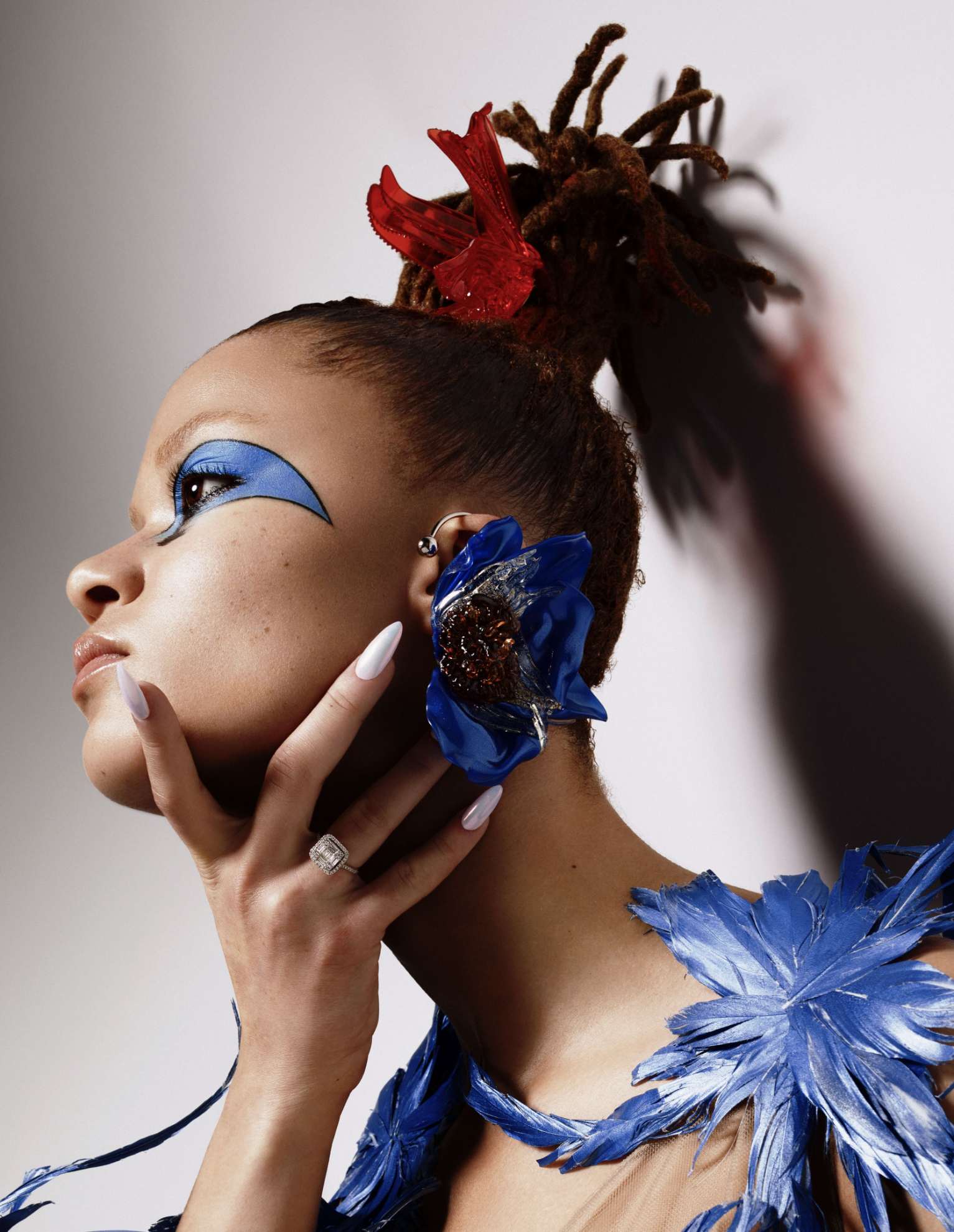 Maël: Vestido, GEORGES HOBEIKA. Headpiece e brincos, ambos em poliéster reciclado, TÉTIER. Anel em ouro branco com diamante, NG DIAMOND. Batons (usados na face) La Sélection Bâtons de Couleur, nos tons Babi, Ancient e Great Sand, € 93, batom (usado como sombra de olhos) Colour Stick, no tom Ultramagnetic, € 31, sombra de olhos Eyeshadow 5 Colours Syren, no tom blue, € 65, eyeliner, no tom Technical Black, € 36, máscara de pestanas Astronomical, € 41, bálsamo de lábios Chromophobia, € 45, tudo BYREDO.