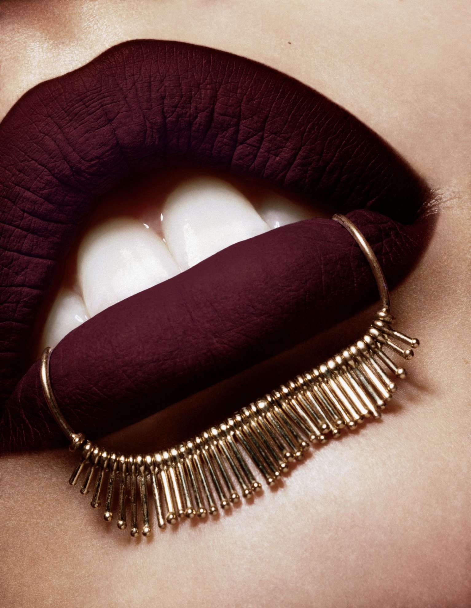 Anna: Lipcuff em ouro amarelo, PERUFFO JEWELRY. Batom Colour Stick, no tom Dravite, € 31, batom Lipstick, no tom Worship Her, € 45, sombra de olhos (usada nos lábios) Eyeshadow 5 Colours Syren Palette, no tom brown, € 65, tudo BYREDO.