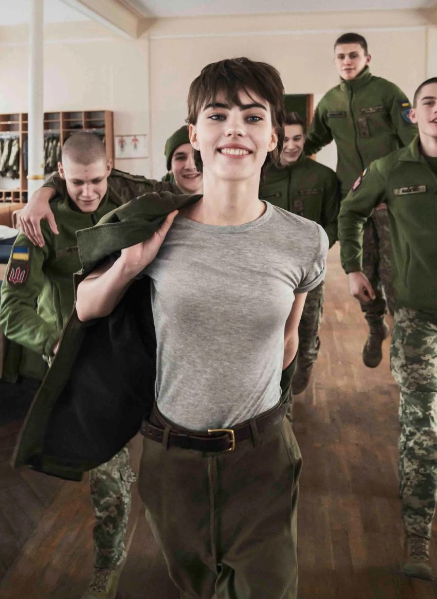 A modelo Karyna Mazyar e os cadetes do Liceu Militar Ivan Bohun em Kiev, fevereiro de 2024 Fotografia: Brett Lloyd, Vogue, Ucrânia.