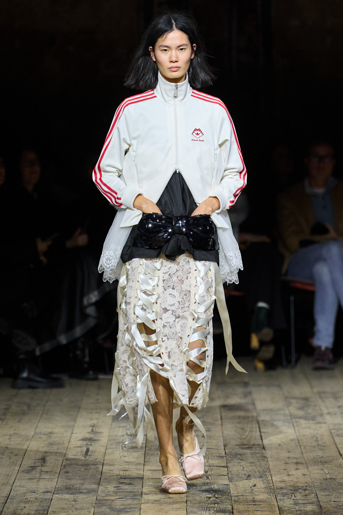 Por falar em ícones com um xodó para o romântico, Simone Rocha continua a dominar a cidade. Outono/inverno 2026 fundiu o seu universo etéreo com referências atléticas, numa colaboração com a adidas que, ainda que inesperada, é extremamente desejável. Laços, fitas e ecos do imaginário irlandês (como Tír na nÓg) cruzaram-se com casacos track, bombers e ténis adornados. Casacos esculturais em materiais utilitários revelaram um lado mais sombrio da coleção. O que destaca Rocha, e que sempre a separou do resto da indústria, é esta entende a delicadeza como força. Esta estação, essa filosofia substanciou-se num campo que lhe é novo: roupa funcional.