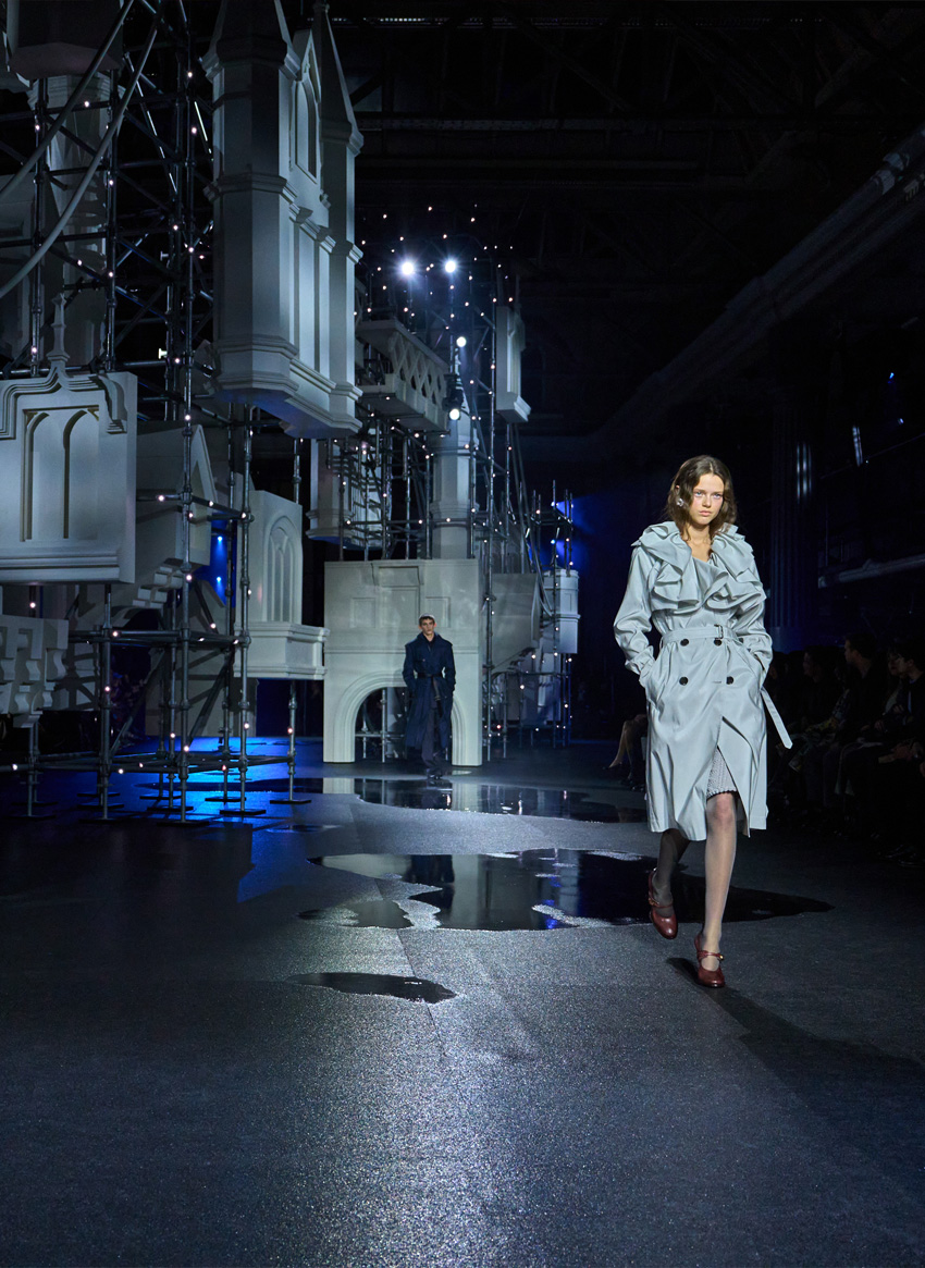 Na Burberry, Daniel Lee encerrou a semana como de costume. Se a estação passada nos levou para um festival no meio do campo britânico, outono/inverno 2026 marcou um retorno decisivo à cidade. A coleção foi uma ode à capital britânica assim que cai o sol—o que, em Londres, no inverno, é às 4 da tarde. Claro que a noite que Lee fala é diferente. É aquela que encontrava quando saia de casa para sair à noite: ruas molhadas, bares cheios. O casaco foi herói absoluto. Trench coats reinventados com golas dramáticas, proporções amplificadas e ombros marcados. Casacos de lã impecáveis, parkas em cabedal, bombers arquitetónicos. O cenário que evocou a Tower Bridge e poças de resina, a imitar água que se acumula no pavimento. No cenário cinematográfico, as propostas do designer britânico são pensadas para a vida real, mesmo que com ambição de filme.