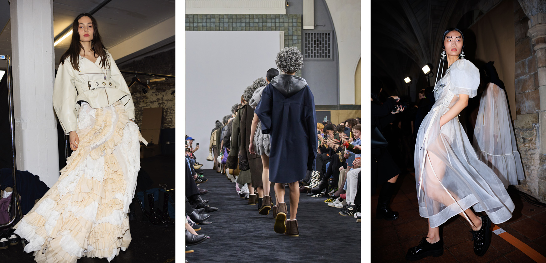 Para Simone Rocha, a influência britânica é bem mais séria, arriscamo-nos a dizer glamourosa. Completando a parte final do tríptico das suas últimas três coleções, a designer irlandesa apresentou “The Wake” (O Velório), inspirado no período de luto de (ironicamente) 40 anos de luto da Rainha Vitória. Com cores escuras, texturas opulentas e transparências vulneráveis, as propostas de Rocha foram extremamente bem-sucedidas. A inspiração que sentiu sua colaboração com Jean Paul Gaultier foi aparente na sua exploração de corpetes. Eternamente capaz de penetrar referências históricas com uma feminilidade refrescante, Rocha fechou a tríade da sua conceção com chave de ouro. Também Richard Quinn se inspirou numa rainha britânica, a Rainha Elizabeth II, pela qual nutre uma admiração admitida. Com um foco em moda nupcial, Quinn canalizou a energia da alta sociedade do século XX.