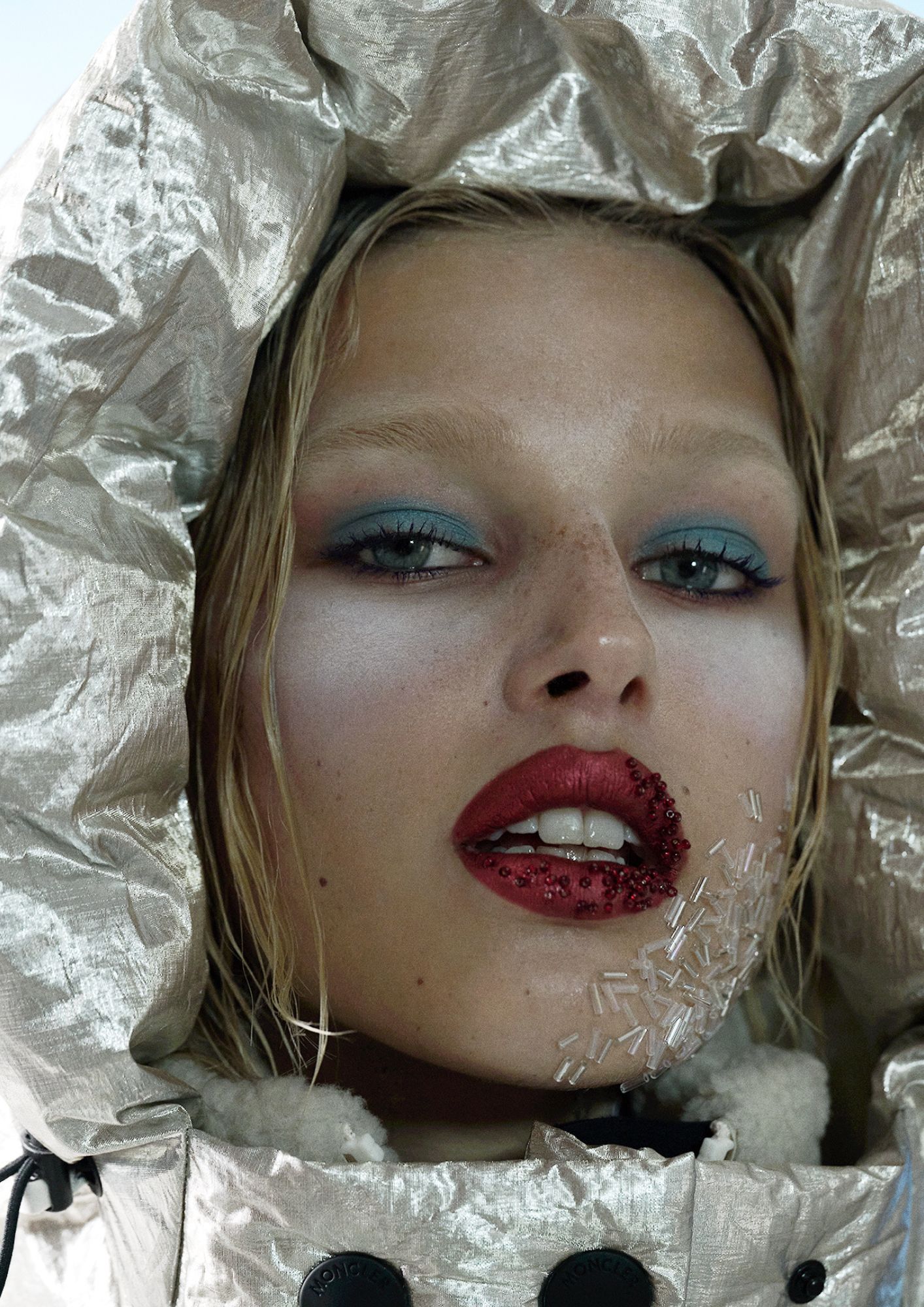 Casaco, MONCLER. Base, Studio Radiance no tom C3, € 45, MAC COSMETICS em PERFUMES&COMPANHIA.PT. Lápis Satin Kajal Liner no tom Black, € 39, em VICTORIA BECKHAM. Sombra de olhos da paleta Pro Palette Paintstick x12 nos tons High Def Cyan e Pure White, MAC COSMETICS. Máscara de pestanas Lash Clash no tom Noir, € 45,99, YVES SAINT LAURENT em DOUGLAS.PT. Batom Powder Kiss Lip + Cheek Mousse no tom Ruby Boo, MAC COSMETICS. Batom Rouge Allure Laque no tom 91 Fancy Prune, CHANEL BEAUTY. Pedras usadas na cara, MICHAELS; Camisola, cuecas, chapéu e suspensórios, tudo CHANEL. Base, Studio Radiance no tom C3, € 45, MAC COSMETICS em PERFUMES&COMPANHIA.PT. Lápis Satin Kajal Liner no tom Black, € 39, em VICTORIA BECKHAM. Sombra de olhos da paleta Pro Palette Paintstick x12 no tom Pure White, MAC COSMETICS. Máscara de pestanas Lash Clash no tom Noir, € 45,99, YVES SAINT LAURENT em DOUGLAS.PT. Batom Powder Kiss Lip + Cheek Mousse no tom Ruby Boo, MAC COSMETICS. Batom Rouge Allure Laque no tom 91 Fancy Prune, CHANEL BEAUTY.