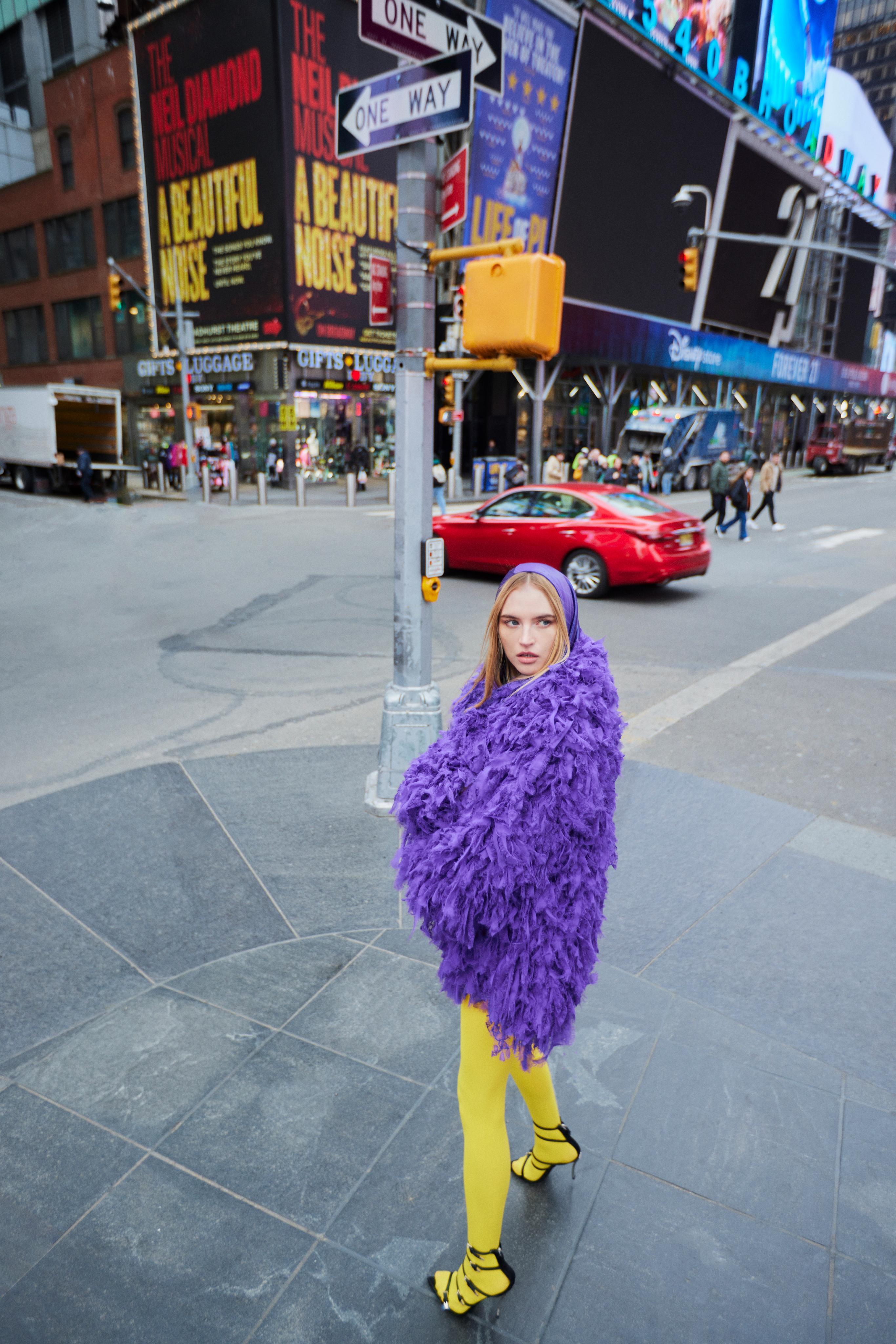 Casaco, vestido e sandálias, tudo VERSACE. Collants, da produção.