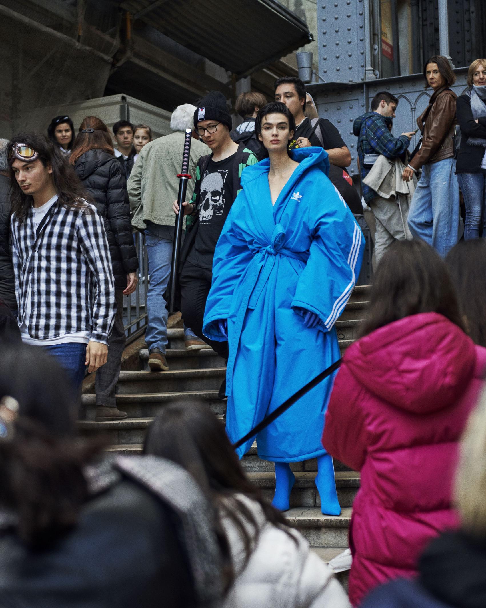 Casaco e botas, BALENCIAGA / ADIDAS. Luvas, BALENCIAGA.