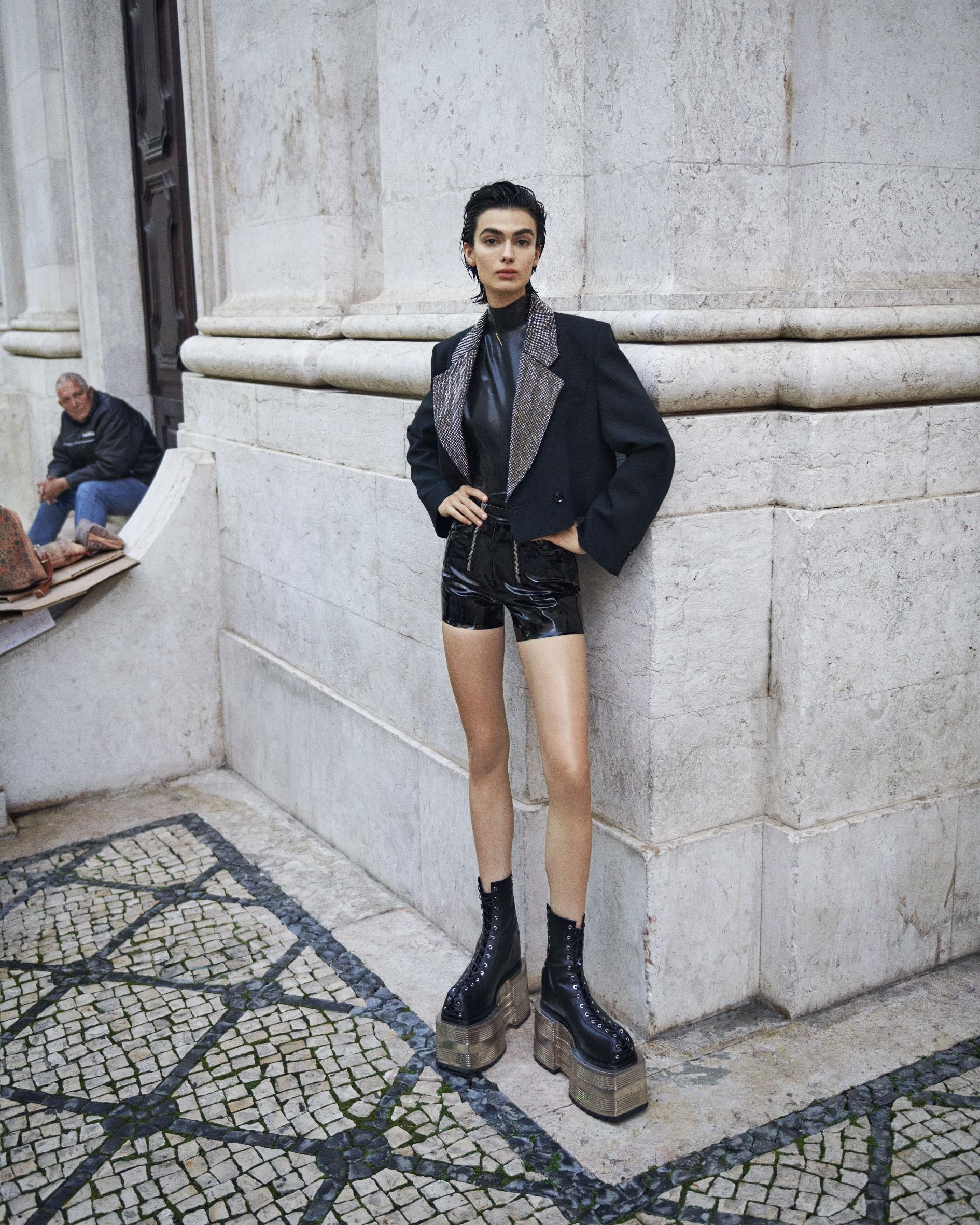 Casaco, NISSE. Top, ATSUKO KUDO. Calções, GMBH. Botas, JEAN PAUL GAULTIER BY OLIVIER ROUSTEING ALTA-COSTURA.