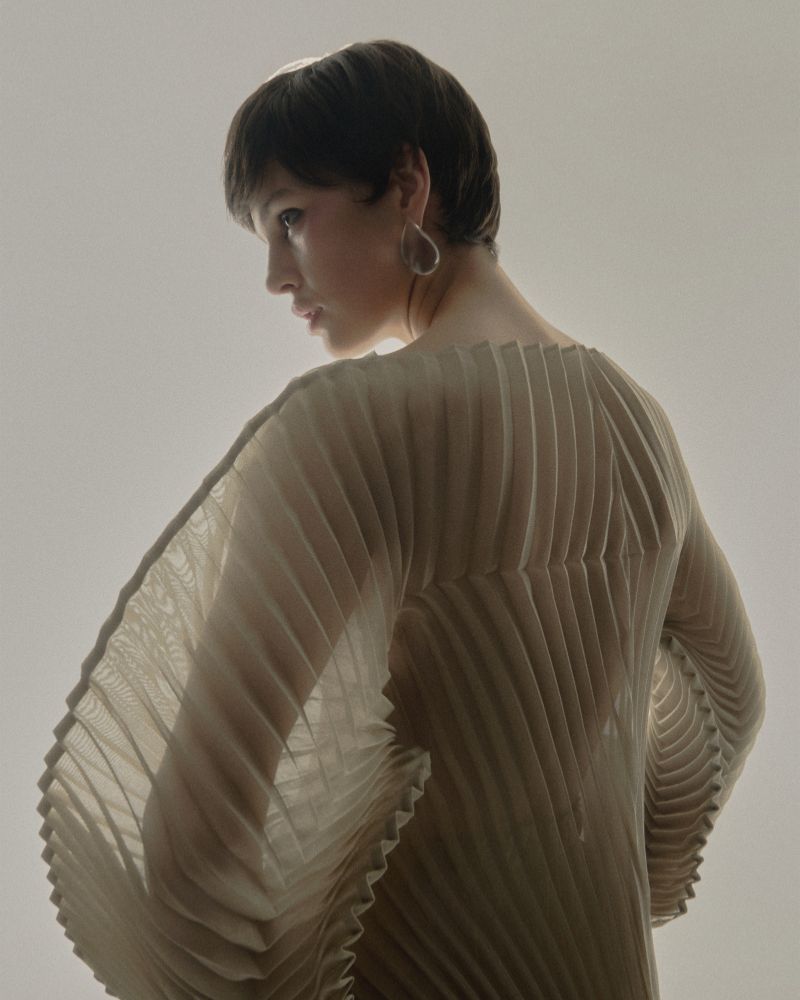Blusa e calças, ISSEY MIYAKE. Brincos, TOSKA. Sapatos, UNITED NUDE.