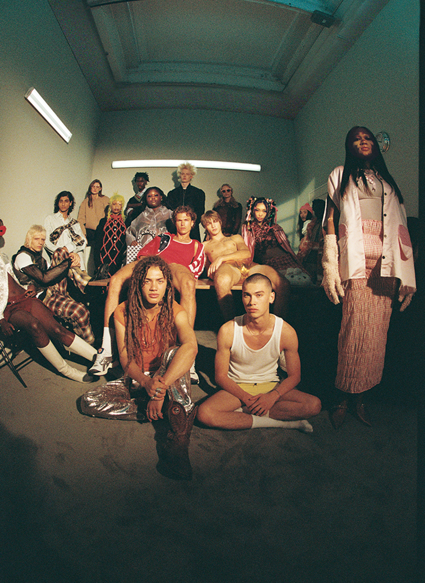 Da esquerda para a direita, Lilie: blazer, calças, sapatos, colar e carteira, tudo CHANEL. Chapéu, ACNE STUDIOS. Óculos de sol, CUTLER AND GROSS. Nastya: casaco, top, calças e sapatos, tudo MIU MIU. Diane: casaco, MAISON MARGIELA. Soutien, da produção. Carteira, PRADA. Coral: arnês e casaco, NOIR KEI NINOMIYA. Botas, DR MARTENS. Valou: casaco, top, collants e cuecas, tudo MIU MIU. Mules, ACNE STUDIOS. Meisheng: casaco, top, saia, calças e botas, tudo ANNA SUI. Carteira, da produção. Olumide: colete, KOLOR. Camisa, calções, meias e brincos, tudo da produção. Sapatos, SWIMS. Akiima: casaco e vestido, LOUIS VUITTON. Botas, GUCCI.