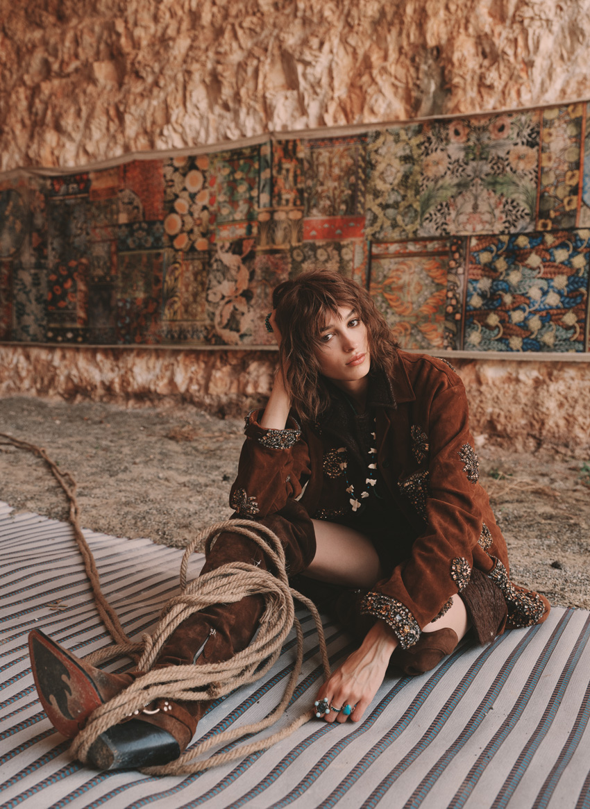 Casaco, calças e botas, tudo LORO PIANA. Chapéu, ALANUI. Anel com turquesa (na mão esquerda), BA&SH. Anel (na mão direita), JESSIE WESTERN. Restantes anéis, da produção.