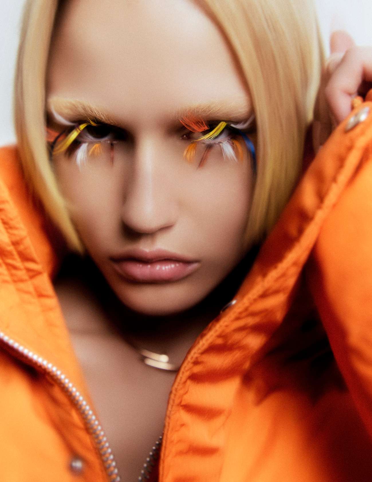 Kate: top, DROME. Brincos Stairway XL em prata de lei banhada a ruténio com diamantes, STATEMENT. Base HD Skin, no tom 1N06 Porcelain, € 39,99, sombra de olhos (usada como eyeliner) da coleção Artist Color Pro Palette 002 Berry, no tom M608, € 35,99, e máscara de pestanas The Professionall, € 28,99, tudo MAKE UP FOREVER, em SEPHORA.PT. Eyeliner (usado nas sobrancelhas) Aqua Resist Color Ink, no tom 12 Striking Chameleon, e sombra de olhos da coleção Artist Color Pro Pallete 003 Tangerine, no tom M705, ambos MAKE UP FOREVER.