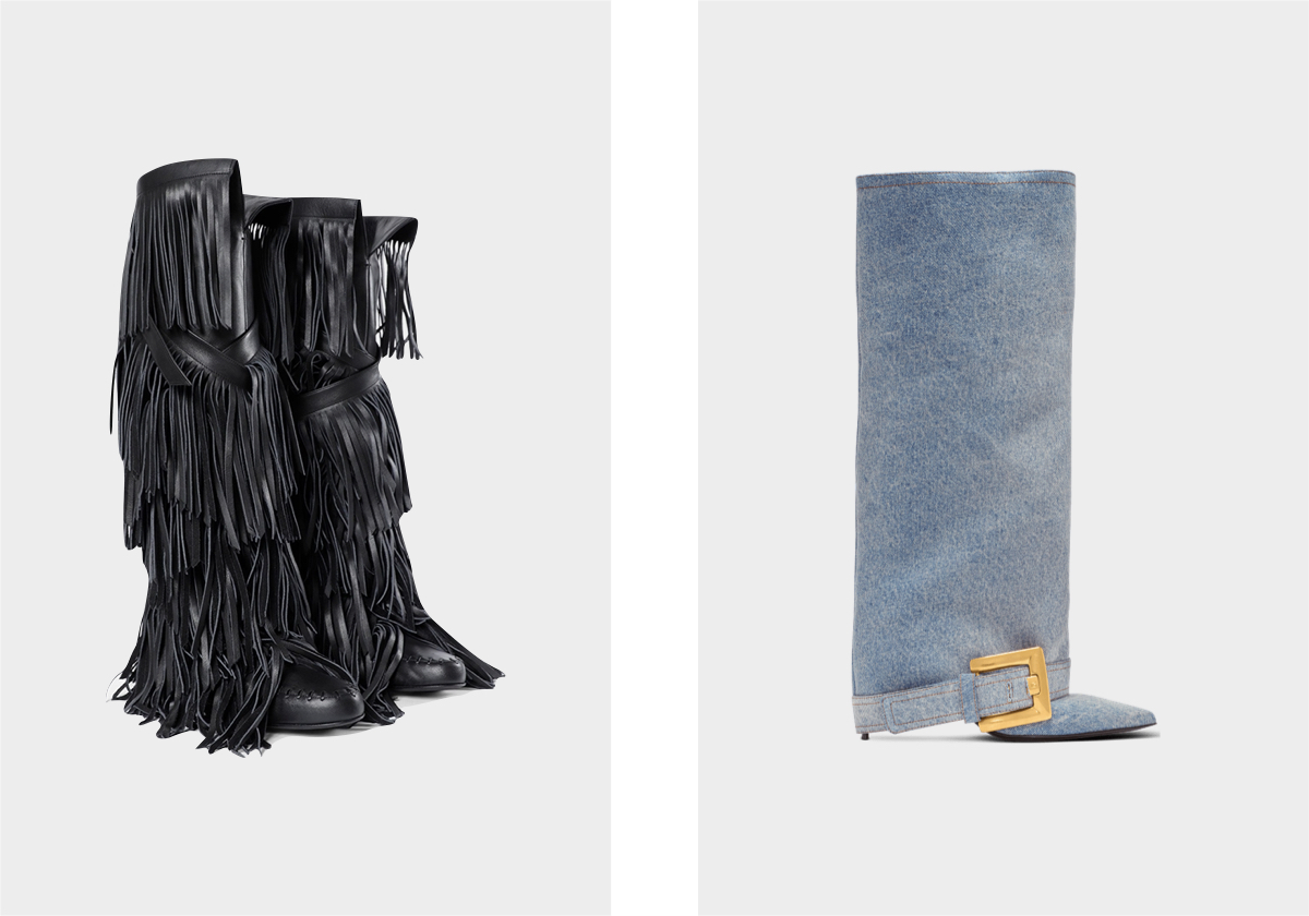 Aala em pele, € 2.490, Ann Demeulemeester; Anthem em denim, € 1.590, Balmain.