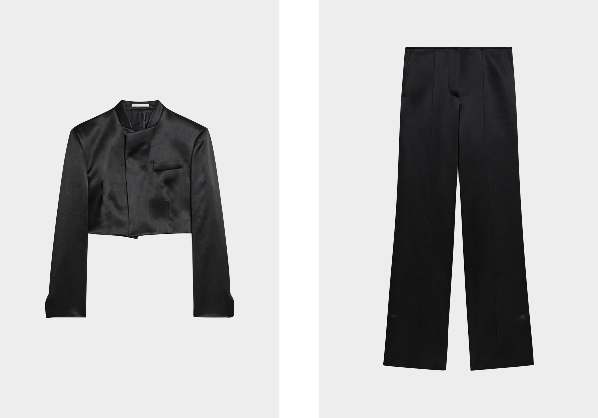 Blazer e calças em cetim, € 640 e € 535, Helmut Lang.