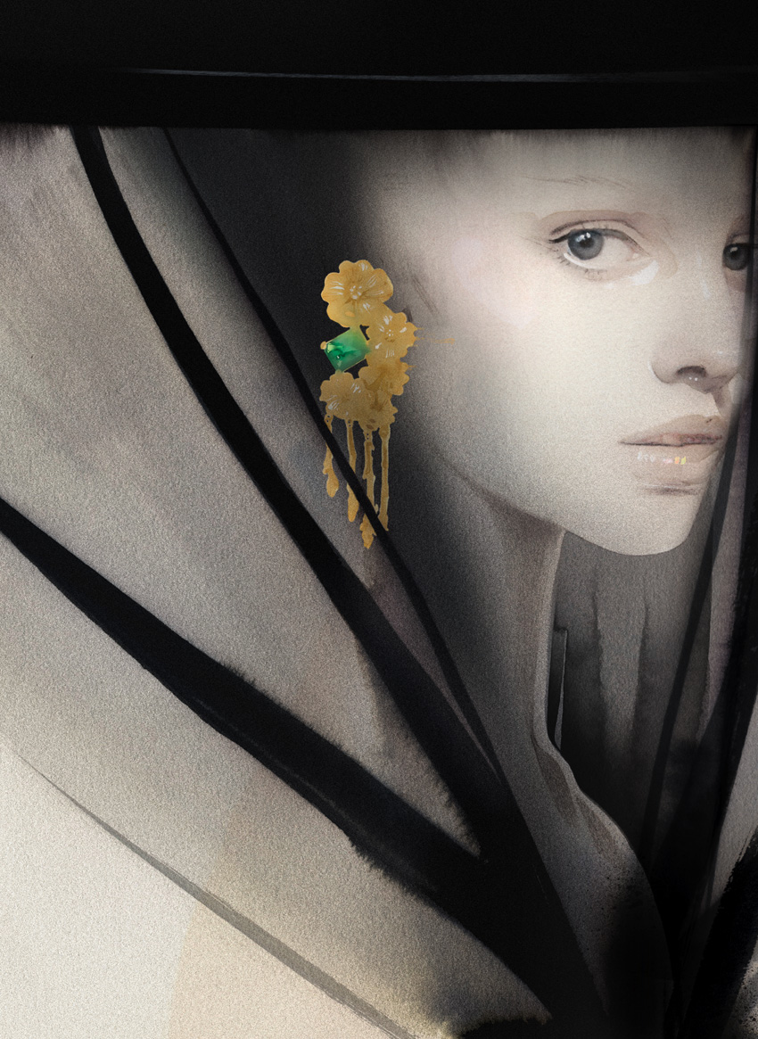 Véu vintage, SCHIAPARELLI ALTA-COSTURA. Brincos Flores da Amália, PORTUGAL JEWELS. Base Synchro Skin Radiant Lifting, no tom 110 Alabaster, preço sob consulta, pigmento em pó Inner Glow Cheek Powder (usado nas maçãs do rosto), no tom Medusa Pink, preço sob consulta, e batom Color Gel, nos tons Ginkgo e Narcissus, preço sob consulta, tudo SHISEIDO. Sombra de olhos Eye Pods, no tom Rendez-Vous, € 92, WESTMAN ATELIER.