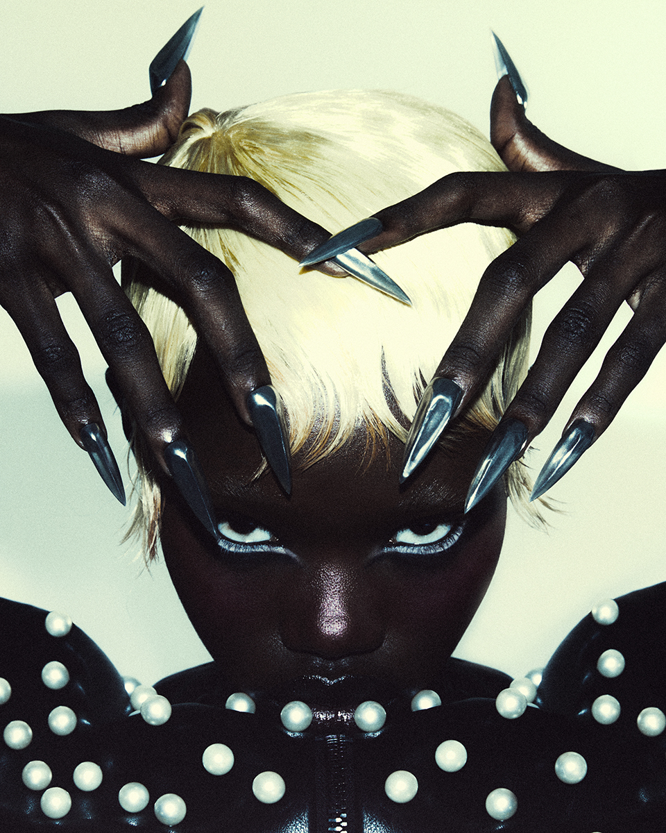 Macacão, colar e tapa-mamilos, tudo NINA RICCI. Base Eaze Drop Blurring, no tom 25, € 43, e corretor Pro Filt’r Instant Retouch, no tom 470, € 37, FENTY BEAUTY. Pó translúcido Loose Setting Powder, no tom Translucent, € 33,95, LAURA MERCIER. Batom Liquid Lipstick Vinyl, no tom Fantôme, € 45, BYREDO. Pigmento metálico em pó e líquido de mistura, no tom Silver, € 17.50, MEHRON.