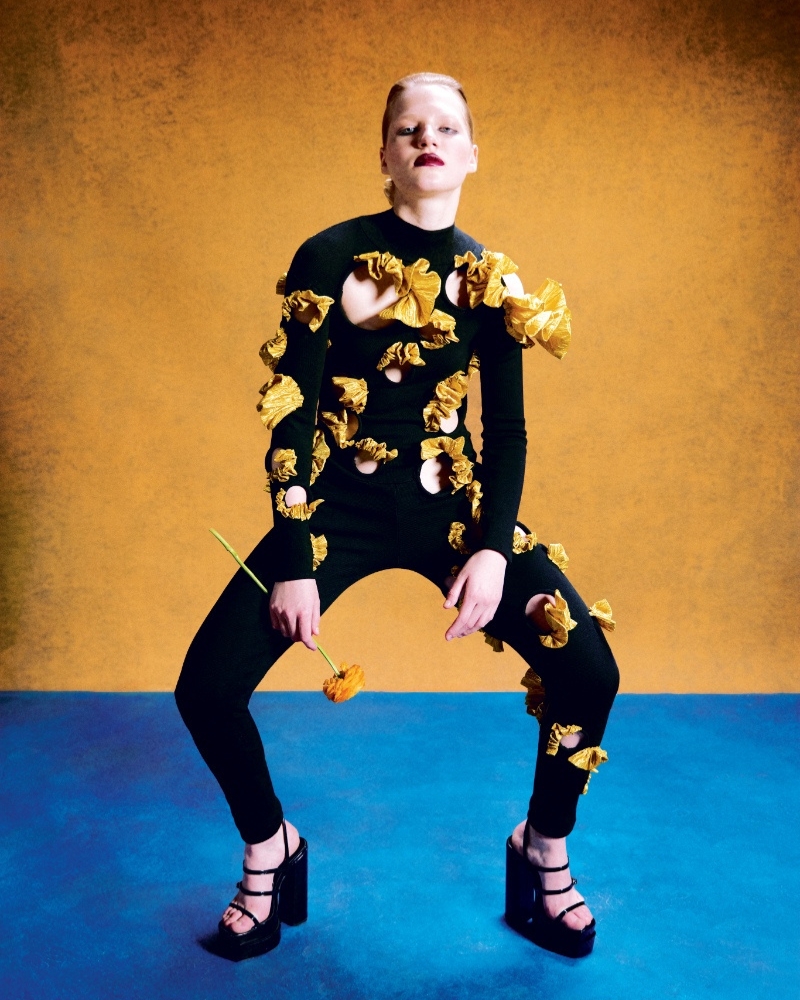 Top e saia, HAUS OF VLAD. Pulseira, DRIES VAN NOTEN. Botas, BALENCIAGA.