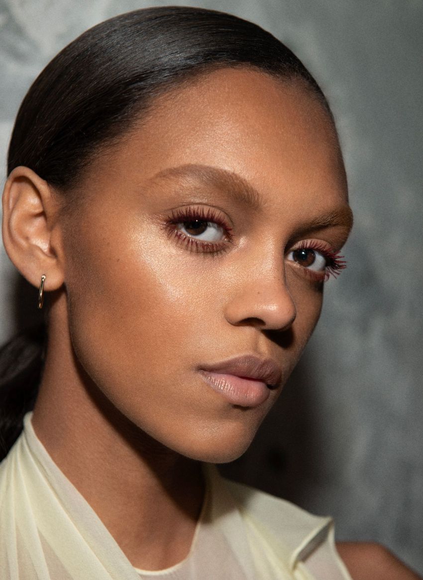 Para a maquilhagem, Pica encontrou este espírito de espontaneidade nos subtis toques de vermelho ardente e de bordeaux felpudo da coleção. Ela trouxe este último diretamente para o rosto com um “belo rímel burgundy que se chama Bordeaux”, que será lançado no próximo mês dentro da gama de cores Future Lash. Essencialmente, o tom de rímel viral que celebridades como Millie Bobby Brown adoram foi reimaginado por Beckham, e nas modelos, Pica aplicou-o com o instinto lúdico da designer - quanto mais desajeitado, melhor. Para manter o equilíbrio do contraste, as sobrancelhas foram iluminadas com uma passagem de FeatherFix Brow Gel em Blonde e a pele foi mantida natural com toques da Concealer Pen e suavemente esbatida com o iluminador The Cell Rejuvenating em Pearlescent e Golden. O objetivo final de Pica era “criar esta aura de suavidade”.
