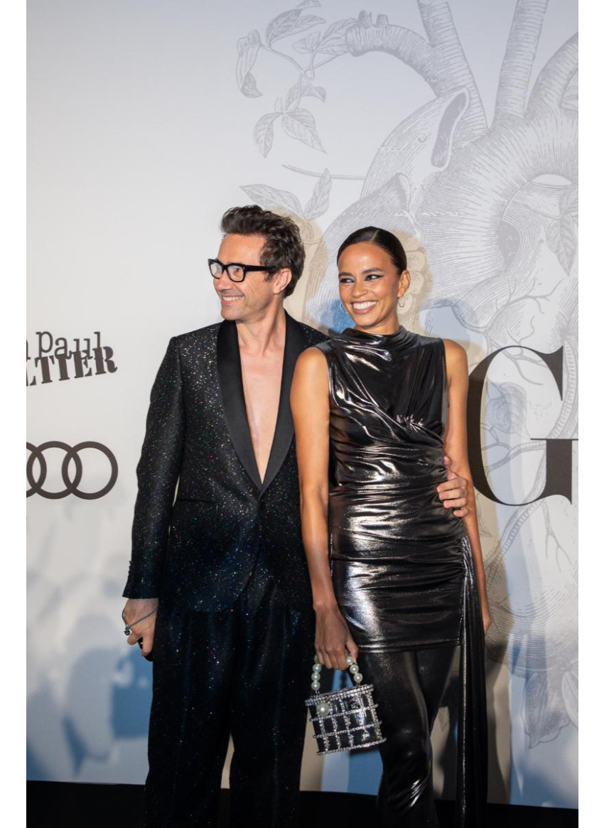 Sofia Lucas, diretora da Vogue, com colar Bulgari, vestido Juliana Herc e sapatos Yves Saint Laurent, e José Santana em Boss e t-shirt The Wrong Bitch.
