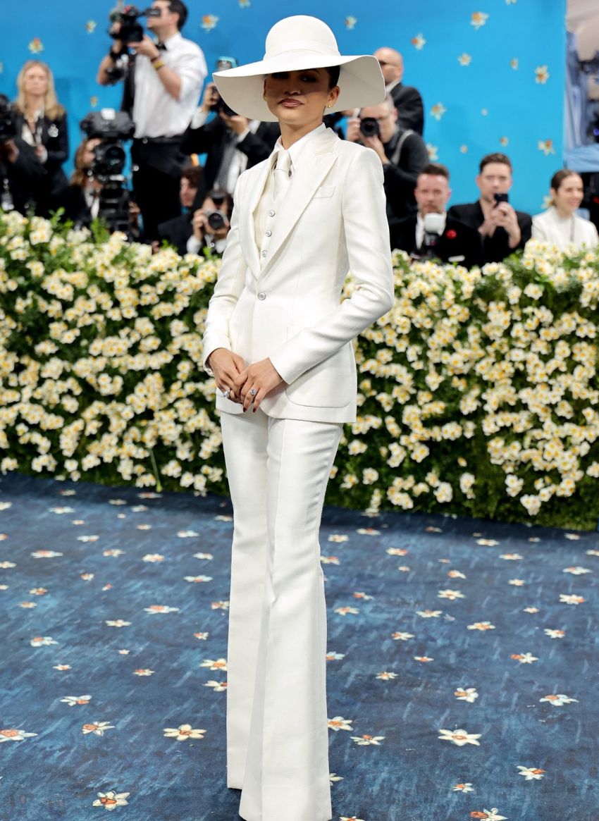 Dado o dress code para a noite — sob o mote de Tailored For You — a escolha de Zendaya para usar um conjunto de fato tradicional seguiu o espírito da noite. A atriz complementou o visual com um chapéu de feltro branco de abas largas e uma carteira Speedy incrustada à mão com pérolas. As suas joias, por sua vez, eram Bulgari.